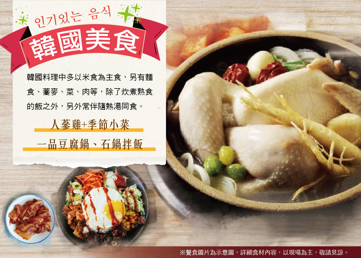 • 素食者貼心小叮嚀:韓國是一個沒有素食的國家,除了華僑開的中華料理餐廳外,皆以香菇火鍋為主。敬告素食客人如前往韓國旅遊,請先自行準備素食罐頭/泡麵等,以備不時之需。