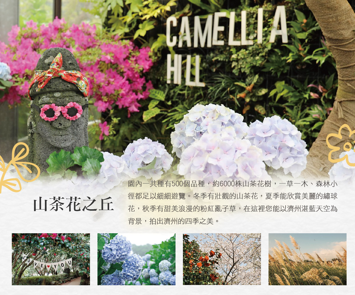 面積達172,000平方公尺,擁有世界上最大、花期最早的山茶花,共計有500多個品種、6000多株的山茶花樹聚集在此。此外,還種植了椰子樹等各種造型樹,為一造景樹木園。另外, Camellia Hill更具備了野生花園、寬廣的草地廣場、生態蓮花池的多樣化植物園區,以及草屋、木屋、鐵皮屋、飯店式公寓等各種住宿設施,還有展示以山茶花製作的工藝品的藝廊和多功能會議室。