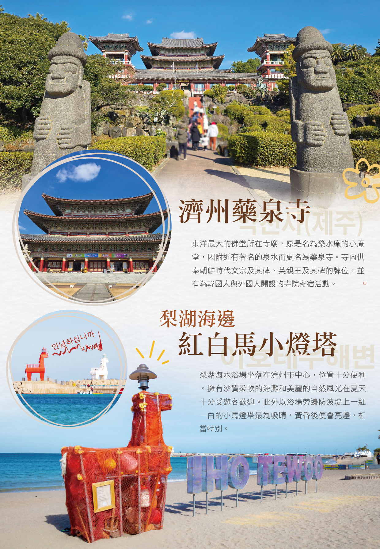 韓系彩粧名品店-韓國文化體驗館(DIY海苔飯卷+韓服體驗)-國際免稅店-道頭峰彩虹海岸道路-梨湖海邊紅白小燈塔-國立濟州博物館-E MART超市-君悅天城度假村