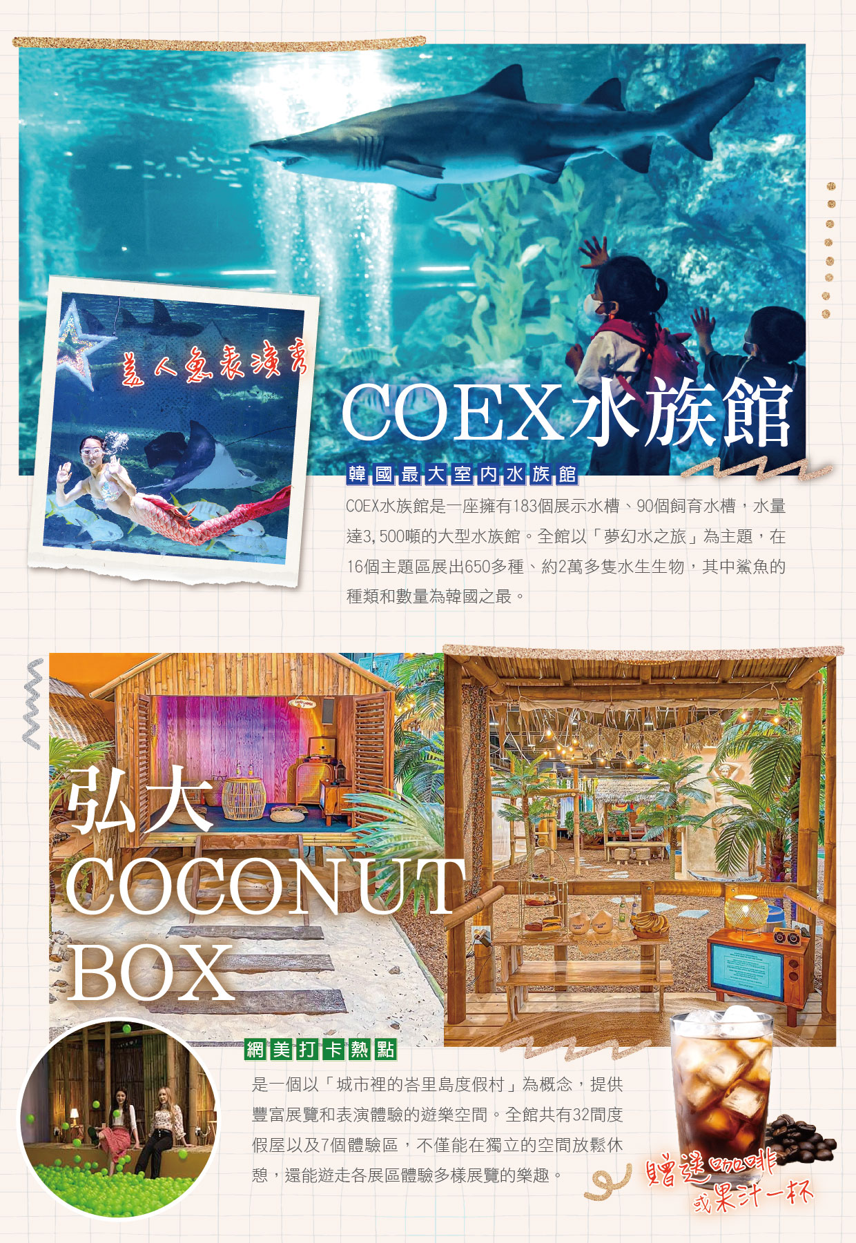 韓國最大水族館【COEX水族館+美人魚秀】- 超夢幻打卡景點【星空圖書館】-【特麗愛3D美術館】- 南洋風情拍照打卡咖啡廳【COCONUT BOX】(贈送咖啡或果汁一杯) -【弘大鬧區】