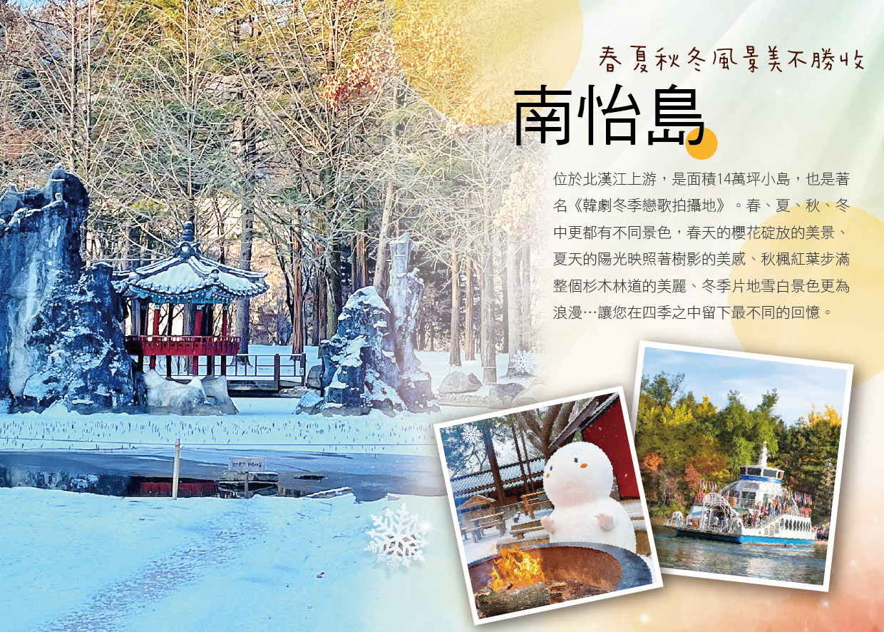 是韓國江原道春川市的小島,位於首爾以東63公里,與京畿道加平郡加平邑隔北漢江相望。 該島是在1944年興建清平水庫時江水淹沒而形成的半月狀島嶼。一踏上南怡島,一定會為島上色彩繽紛的秋日美景所驚嘆。許多南韓的偶像劇都曾在此取景,天空下的水杉林道因電視劇《冬季戀歌》取景而聞名,至今仍吸引許多劇迷造訪。踩著滿地的落葉行走,就像走在金色地毯上,充滿浪漫。