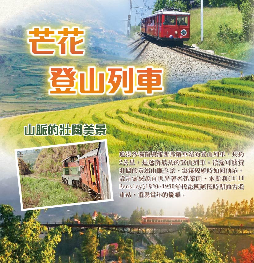 連接沙壩鎮與潘西邦纜車站的登山列車,長約 2 公里, 前越南旅程最長的登山列車。從沙壩飯店出發,終點是番西邦纜車站,沿途可欣 連山脈的壯闊美景,而起點沙壩站是由世界著名建築師 •本斯利(Bill Bensley)設計,靈感汲取法國 1920~1930 的古老車站,重現當年的優雅。