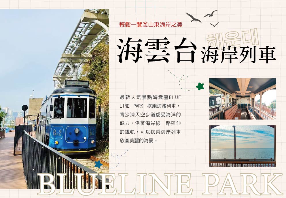 海雲臺Blueline Park是位於海雲臺尾浦-青沙浦-松亭區段長達4.8公里的舊鐵道所改建而成,是釜山海雲臺觀光特區的核心觀光設施之一。沿著海岸線一路延伸的鐵軌,可以搭乘海岸列車或天空艙欣賞美麗的海景。搭乘海岸列車可將東釜山的海景盡收眼底。