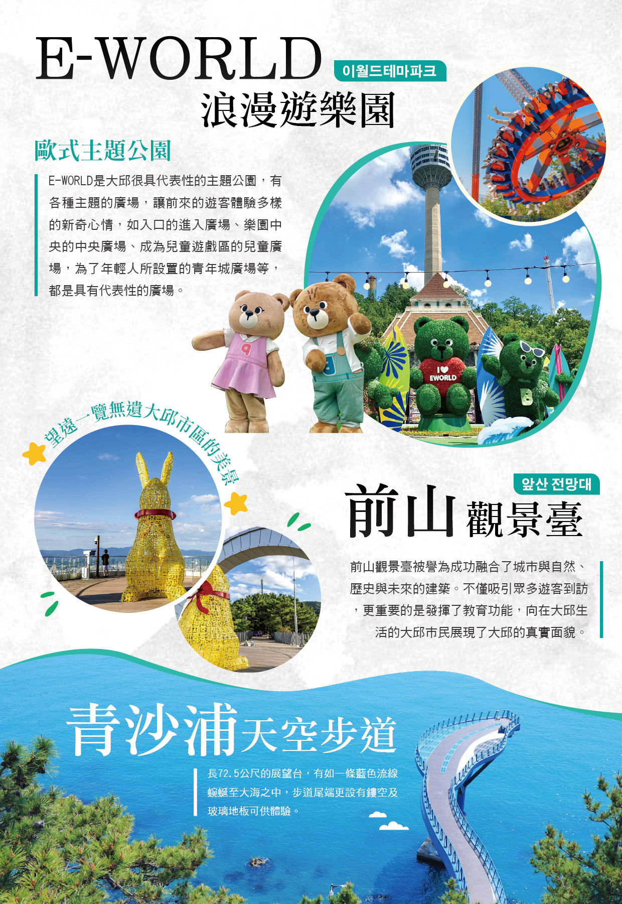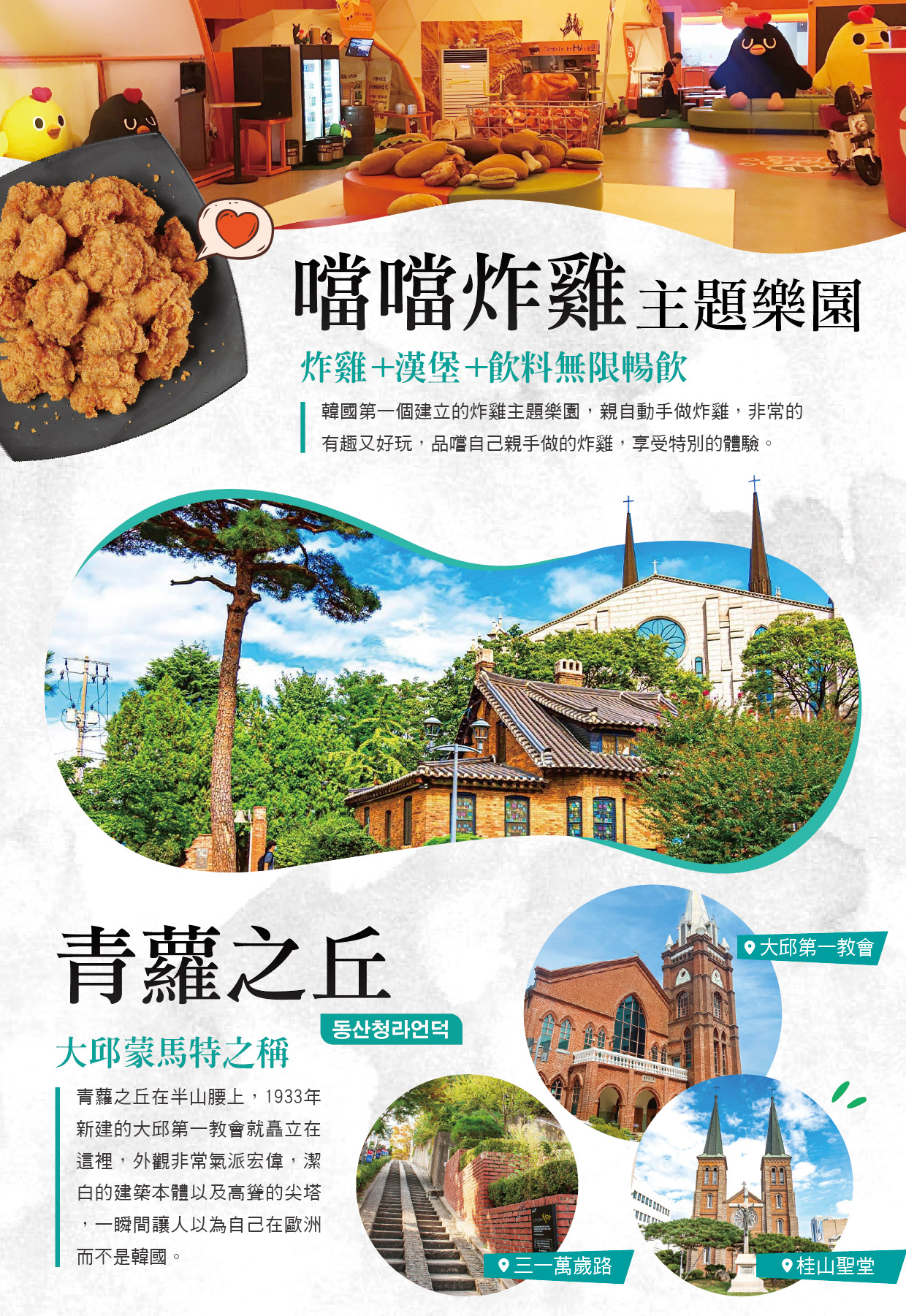 到韓國旅遊必吃韓式炸雞,你知道韓國炸雞的起源地就在大邱嗎?而在大邱必吃的炸雞品牌就是「噹噹炸雞」,現在「噹噹炸雞」更設立了「噹噹炸雞主題樂園」,在「噹噹樂園」裡不只可以看到許多跟雞相關的站的展示品,還可自己動手做炸雞,是現在大邱親子旅遊中最夯的大邱景點之一,在工作人員的解說下,讓您瞭解炸雞體驗的活動與過程,還可與樂園內各式各樣可愛的造型雞合影。